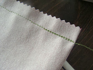 Następnie zaprasowałam boki i dolny brzeg pojedynczo, przypięłam szpilkami kieszonki do materiału i przyszyłam najpierw 1,5 mm od brzegu, wzmacniając kolejnym obszyciem 5 mm od poprzedniego szwu.